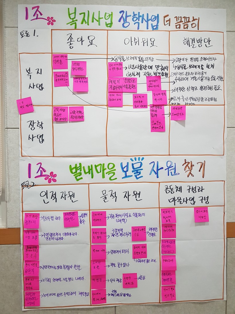 이번 3차 토론회는 조금 더 협의체 의도를 접근하여 현재 하고있는 복지사업, 장학사업이 잘한점과 아쉬운점, 이렇게 달라졌으면 좋겠어요하는 주제, 우리 별내면의 인적자원, 물자원에 대해 찾아보기, 우리의 출연금을 잘 사용하는 방법에 대해 토론해보았습니다.